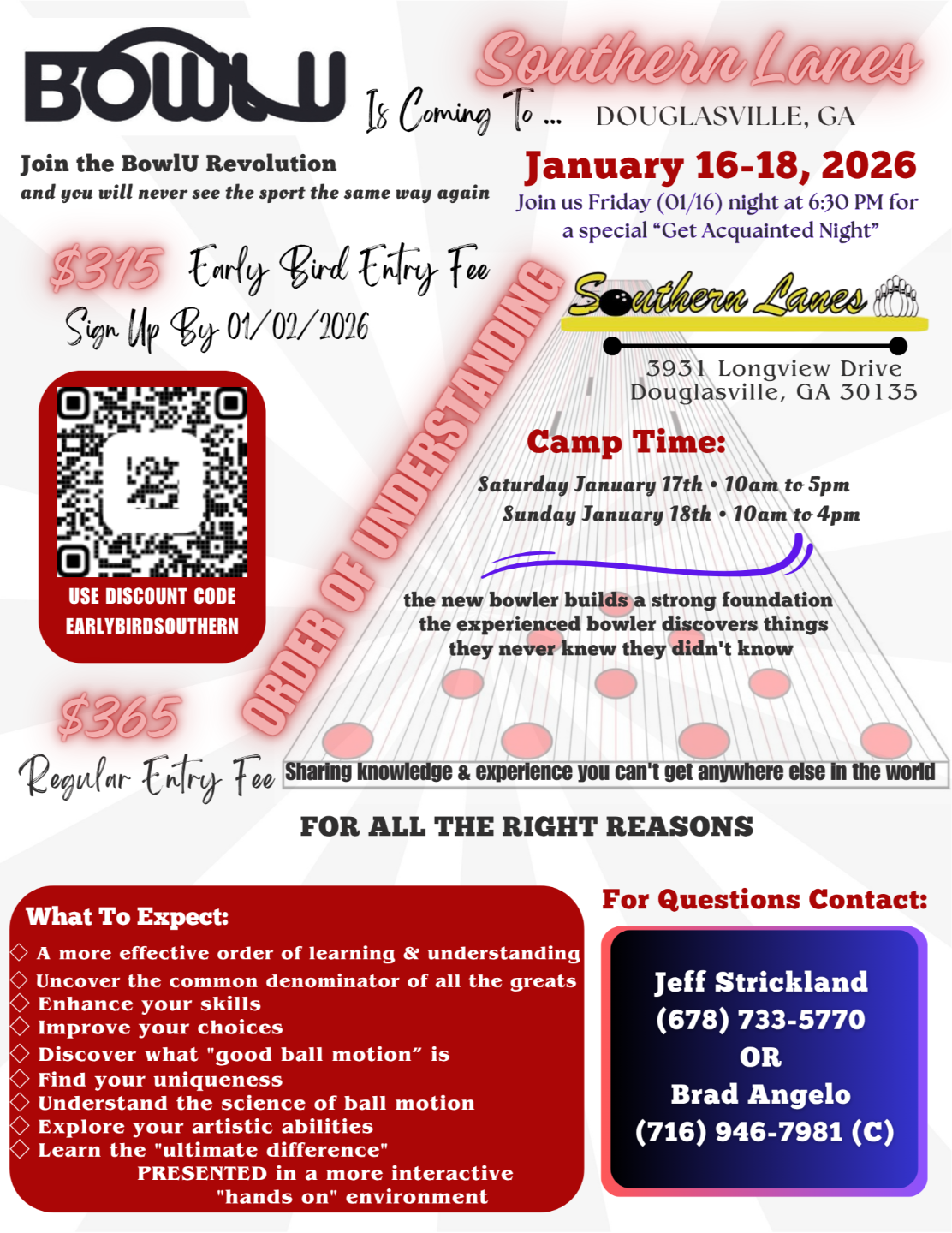 This camp is the greatest value in the sport of bowling. From the beginning, BowlU decided to keep the cost of this camp less than the cost of a bowling ball because when it comes to making a choice, the value of this camp will always be many times more valuable than a bowling ball. You will leave with a new perspective, knowledge, and experience you can't get anywhere else. Our goal is to spread a level of pride and respect that will last your entire bowling career.